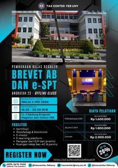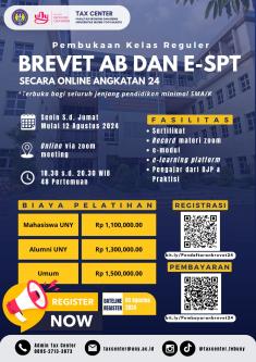 Brevet pajak FEB UNY hadir kembali pada batch 29 ini akan dilaksanakan Brevet Pajak AB dan C. Berikut merupakan pamflet pendaftaran Batch 29: